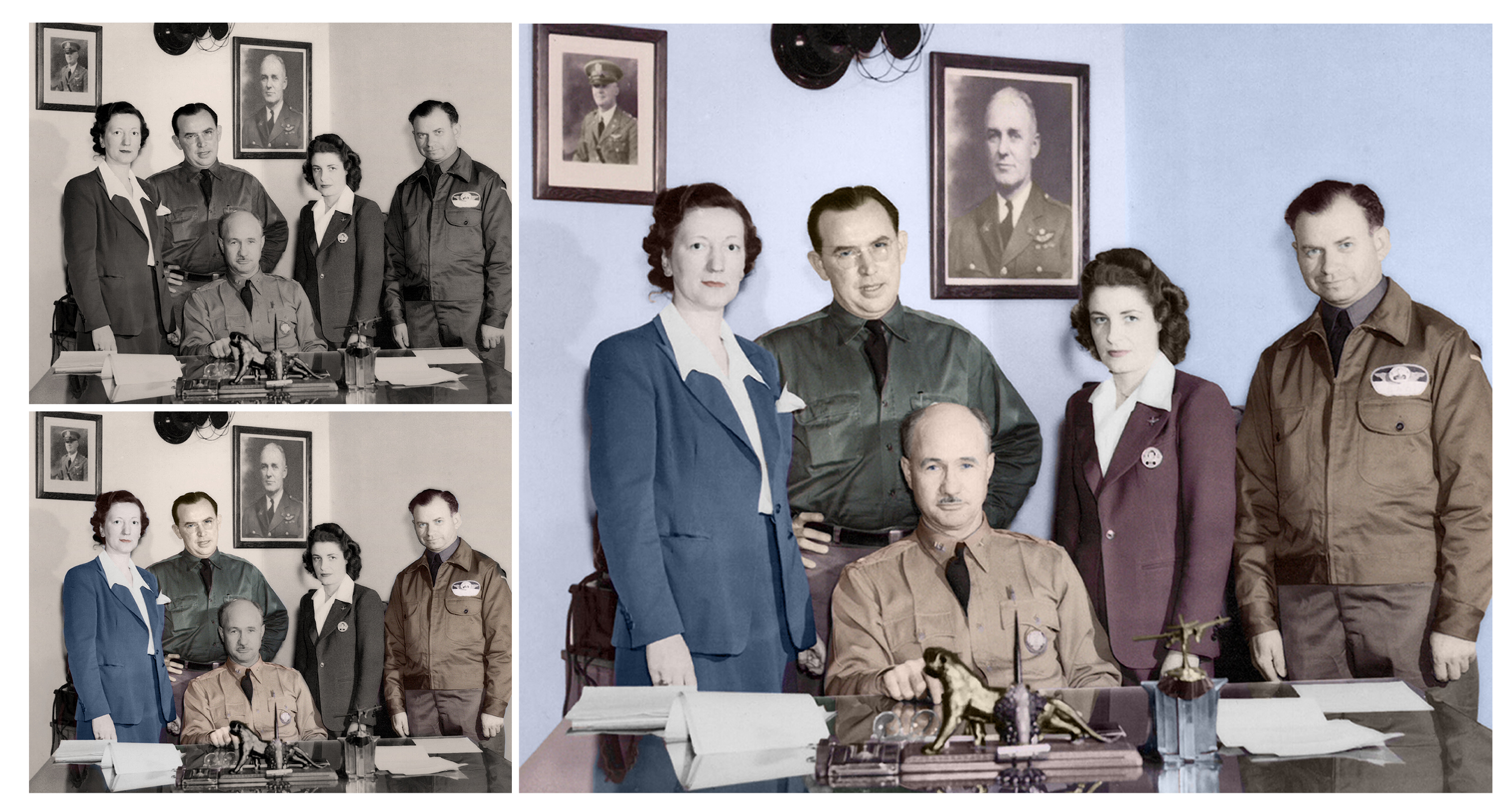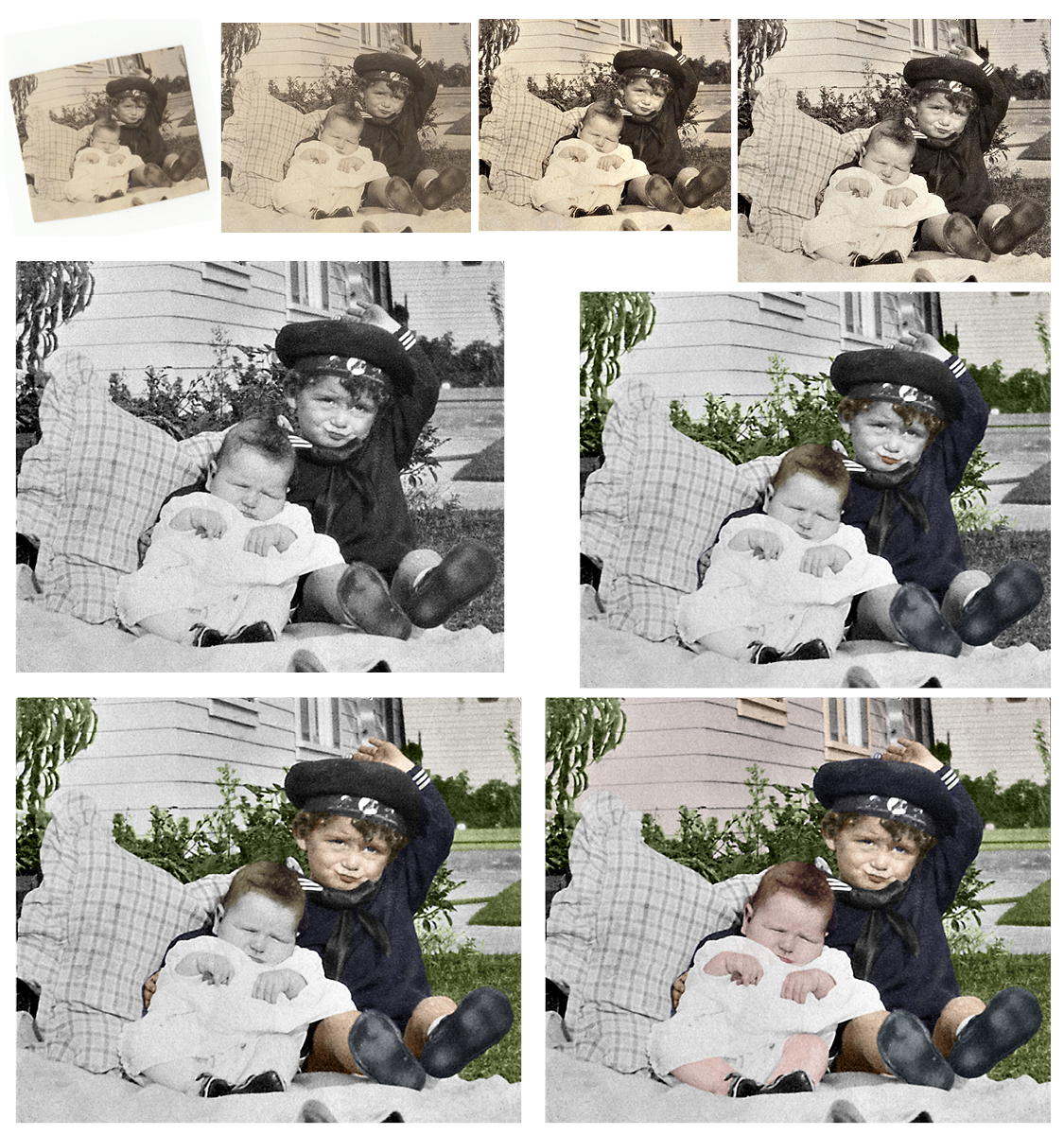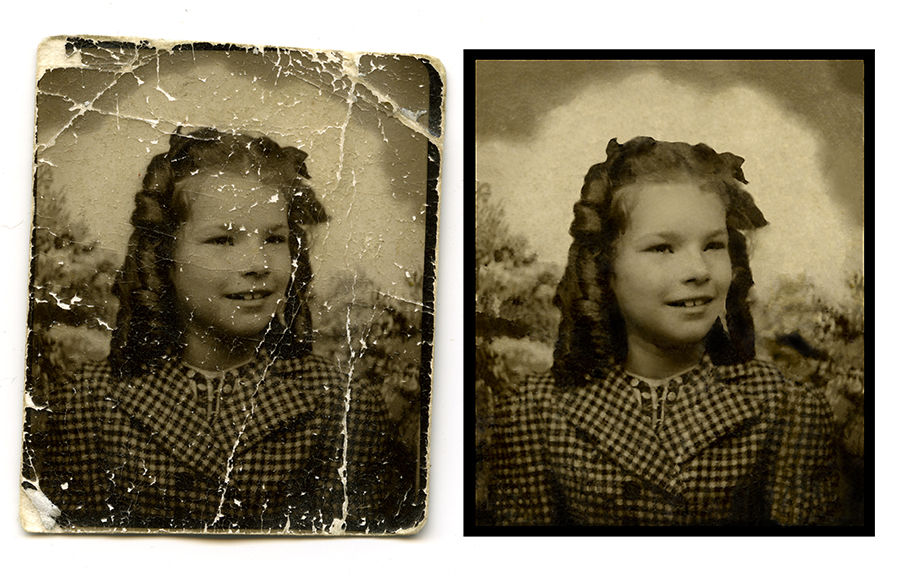 Photo Restoration and Coloring Each item has to be colorized individually before I could turn it into an oil painting. Tada! Removed graffiti, powerlines, and retouched color. A tiny photo kept in a wallet for 20 years.